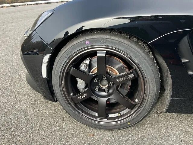 今回の走行にあたって、車両の仕様やサスペンションのセッティングは岡山国際サーキットを走った状態から一切変更していません。タイヤも、岡山で下ろしたばかりの**BRIDGESTONE POTENZA RE-71RS(265/35R18)**を丁寧にクリーニングしてそのまま使用。あえて仕様を変えないことで、自分たちが導き出したセットアップの汎用性と、タイヤの持つ真のポテンシャルを検証しました。当日のタカタサーキットも絶好のアタック日和。 マシンのバランスは岡山同様に素晴らしく、コースイン直後から確かな手応えを感じていました。